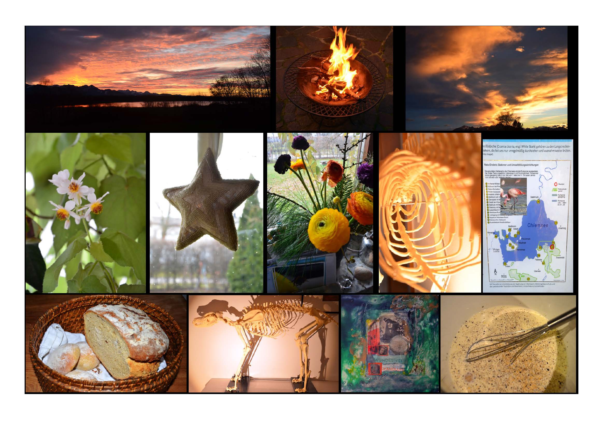 bilderreigenDas Jahr gehen lassen, das Neue begrüßen: Sonnenuntergang an der Alpenkette, Neujahrsfeuer, Sonnenaufgang, Zimmerlindenblüte, Glitzerstern, Frühlingsboten, Brustkorb, Florida-Feeling mit Flamingos am See, Neujahsrbrot gebacken, Anatomiestudie mit „Wilma“, Bild „Wunderweib“ aufstellen, Creme Brülee rühren……..