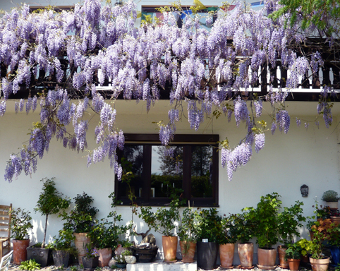 Die „wisteria sinensis“, die rechtsdrehende chinesische Glyzinie, auch Blauregen genannt, blüht üppigst, noch ehe die Blätter sprießen. Es duftet der ganze Garten und die Bienen sind ganz gierig. Übrigens sind die Blüten – und nur die Blüten! – essbar. Sie schmecken leicht süßlich und passen zu Salat und Pasta! Unterm Balkon geschützt habe ich meine Topfrosen gut über den Winter gebracht: sie treiben alle super aus und setzen viele Knospen an.