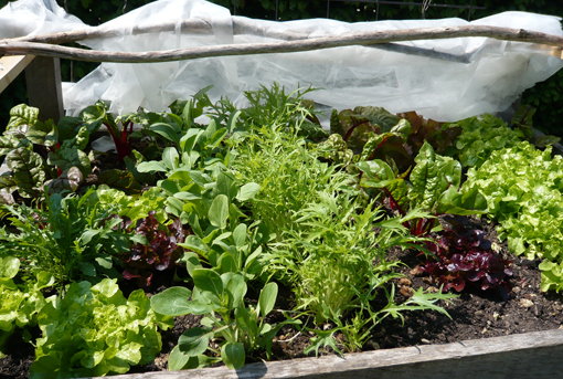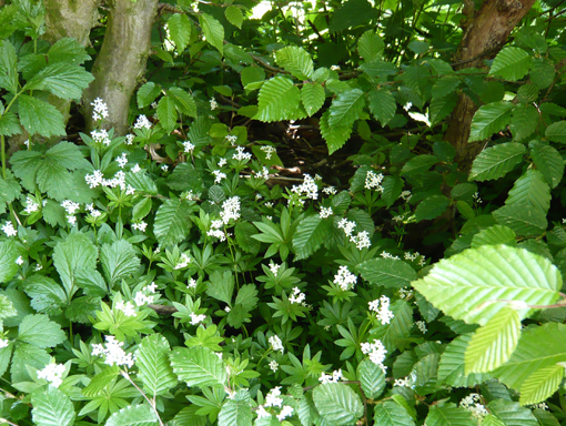 Essbar und wunderbar knackig sind auch schon die verschiedenen Salate aus dem Früh-Hoch-Beet. GRündonnerstag wurde zum ersten mal geerntet. Und auch der Waldmeister findet fast täglich Verwendung: frisch mit Blättern der Erdbeermelisse und Zitronenmelisse als Tee aufgegossen oder leicht getrocknet und dann mit Weiswein aufgegossen als Ansatz für die Maibowle. Vor zwei Jahren hab ich meinen kleinen Balkon-Waldmeisterbestand da hingesetzt wo er auch hingehört: unter eine Buchenhecke. Jetzt wuchert er schon richtig!